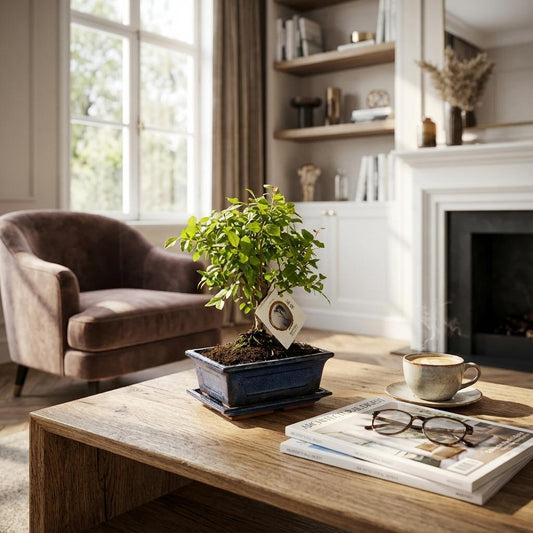 Bonsai miniature tree with an S-shaped trunk in a ceramic bowl | Houseplant