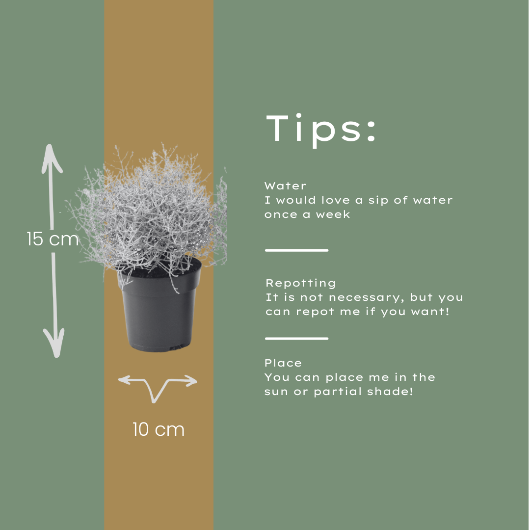 Laat je verrassen door de bijzondere uitstraling van de Calocephalus brownii, beter bekend als het zilverstruikje. Deze set van zes sierlijke planten voegt direct stijl en rust toe aan je tuin, balkon of terras. De verfijnde, zilvergrijze vertakkingen geven de plant een bijna grafische structuur – modern, elegant en tijdloos.