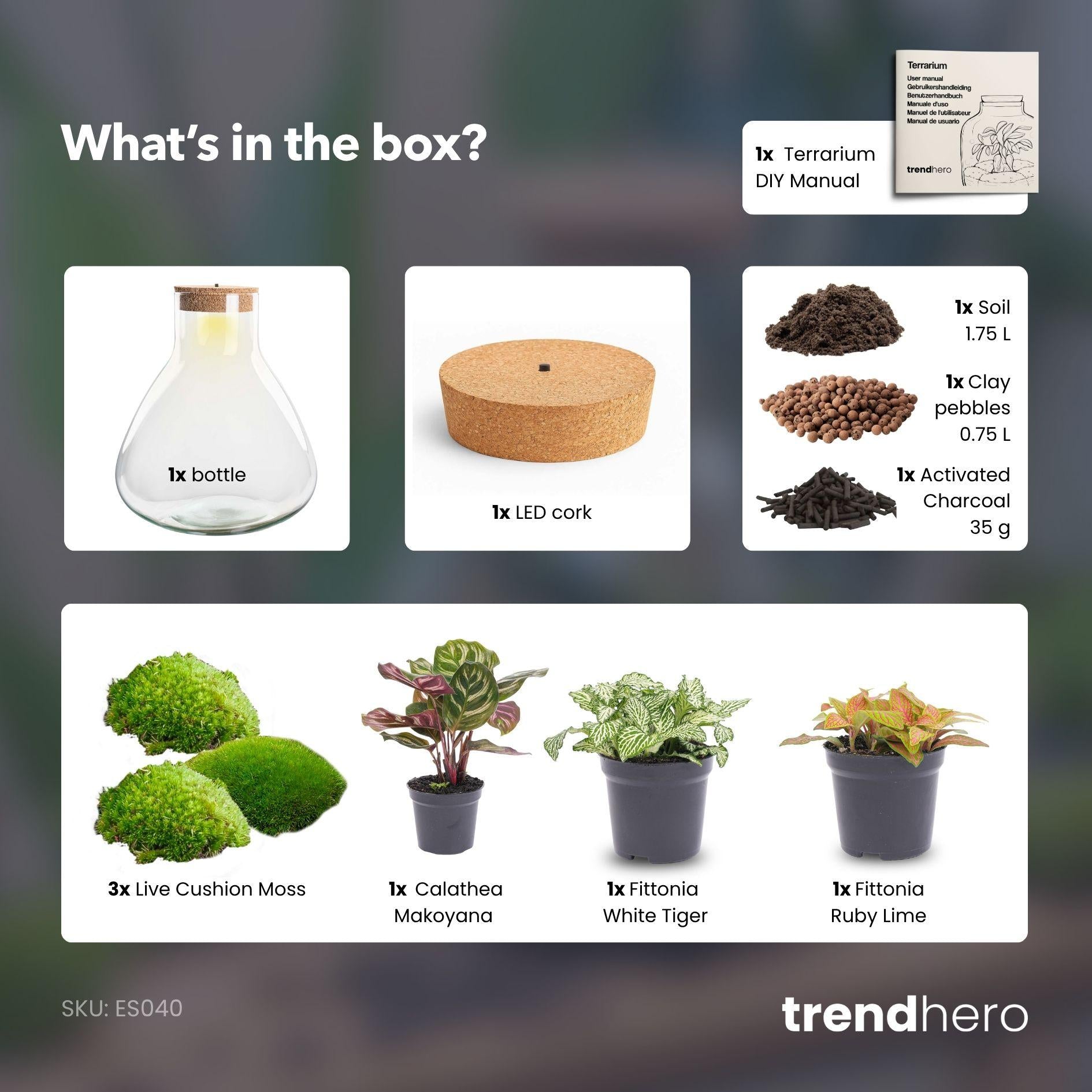 Dit terrarium vraagt weinig onderhoud en is ideaal voor beginners. De luchtvochtigheid regelt zichzelf waardoor de planten in optimale conditie blijven. De warme gloed van de LED-verlichting geeft extra sfeer en maakt het terrarium zeer geschikt als cadeau.