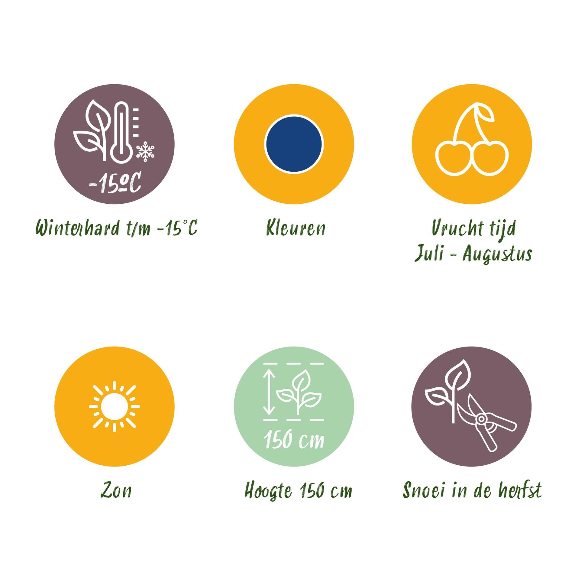Een rijke oogst en een decoratieve uitstraling komen samen in deze veelzijdige blauwe bes. De frisgroene bladeren vormen een mooi contrast met de stevige, diepblauwe bessen die later in het seizoen verschijnen. Deze fruitplant brengt leven en kleur in de tuin en is tegelijk een waardevolle toevoeging voor wie graag geniet van zelfgekweekte vruchten. Door zijn betrouwbare groei en aantrekkelijke uiterlijk past deze variëteit perfect in borders, maar komt hij ook uitstekend tot zijn recht in potten op balkon of terras.