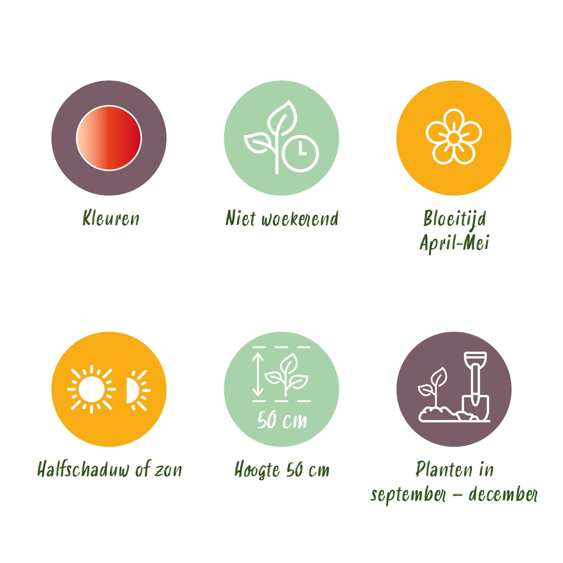 De bollen zijn eenvoudig te planten en vragen weinig onderhoud. In het voorjaar trakteren ze u op een betoverende bloemenzee die direct sfeer en vrolijkheid toevoegt. Perfect voor zowel kleine stadstuinen als ruime terrassen. Combineer de Tulipa Gudoshnik Double met andere voorjaarsbloeiers en creëer een uniek kleurenpalet in uw buitenruimte.
